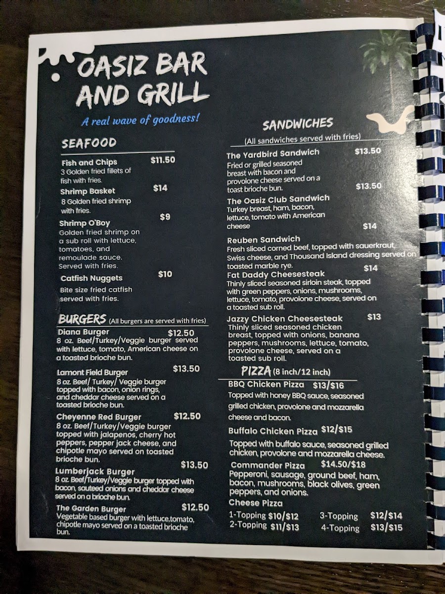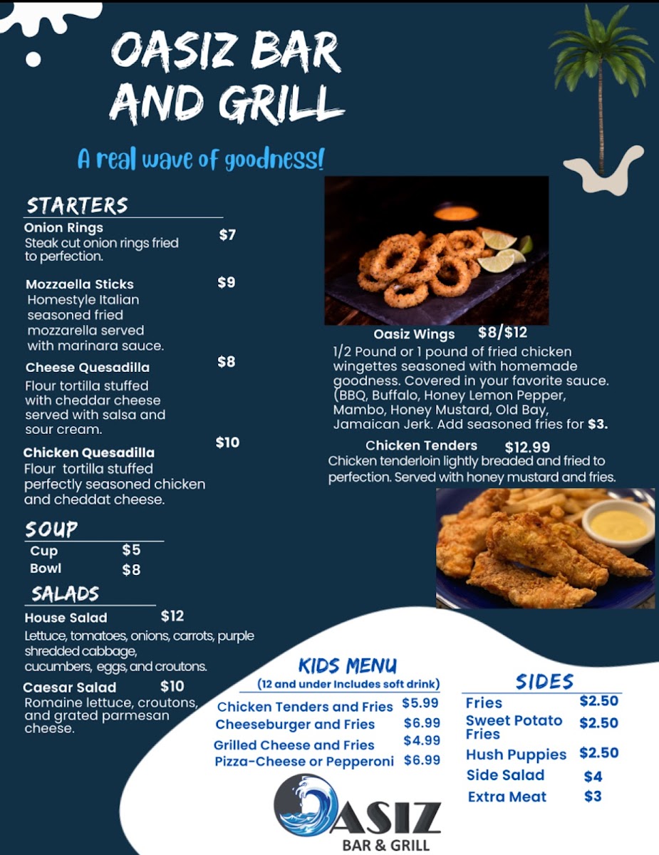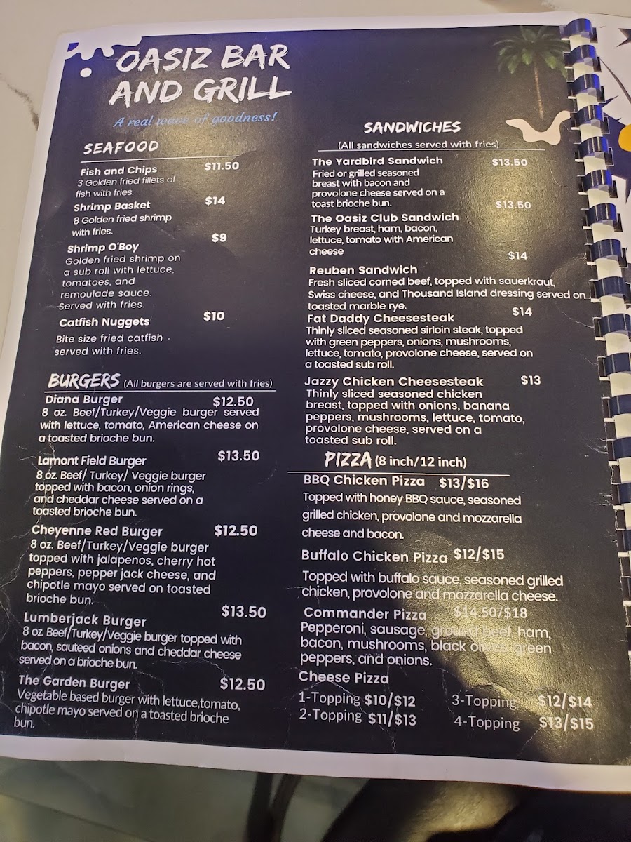 Introducing the menu at Oasiz Bar & Grill, a delightful escape located at 5723 Tuxedo Rd, Hyattsville, MD. This neighborhood gem offers a curated selection of pub favorites, from hand-tossed pizzas to mouthwatering wings and flavorful sandwiches. The lively atmosphere is perfect for unwinding after a long day, making it a favorite spot for locals.